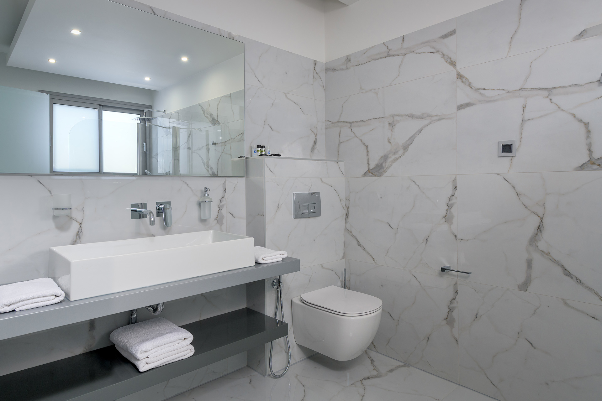 It consists of 7 bedrooms which sleep up to 13 people and 8 bathrooms. A separate big kitchen area and a large living and dining room. Every room leads to balconies or terrace with a panoramic and uninterrupted view to the garden.