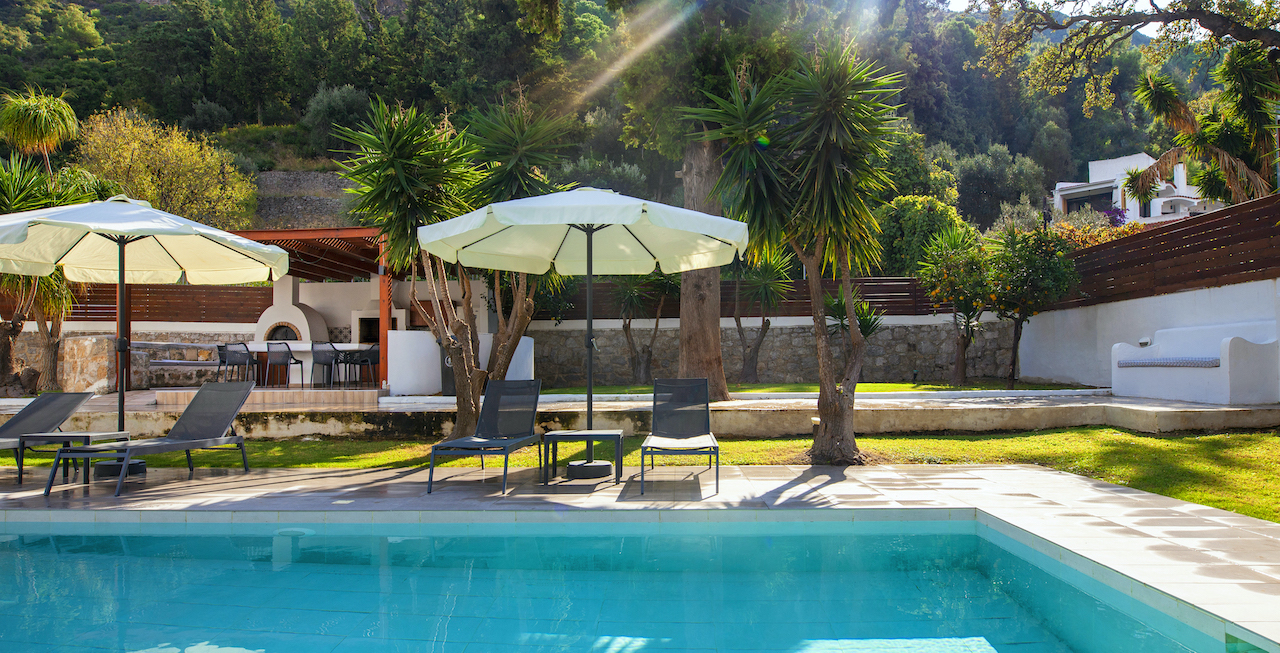 Authentic Greek architecture pairs beautifully with modern amenities in this gorgeous luxury villa rental in Ixia Rhodes.